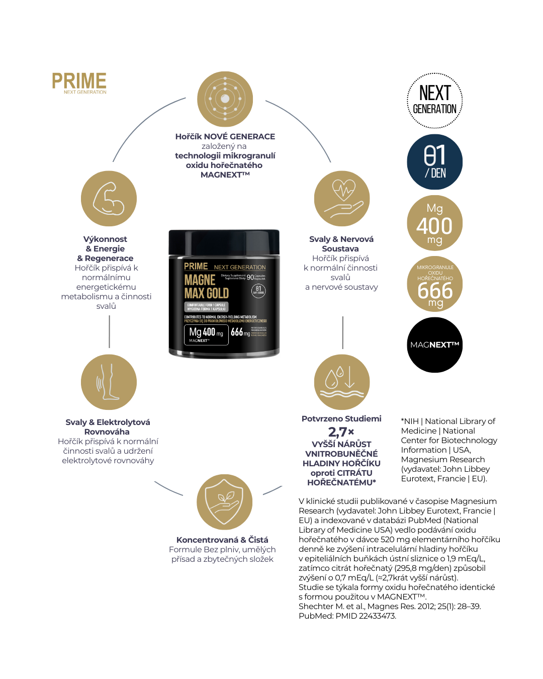 - Badanie kliniczne wykazało 2,7× większy wzrost poziomu magnezu wewnątrz komórek niż w przypadku cytrynianu magnezu (tlenek identyczny jak w MAGNEXT™).
