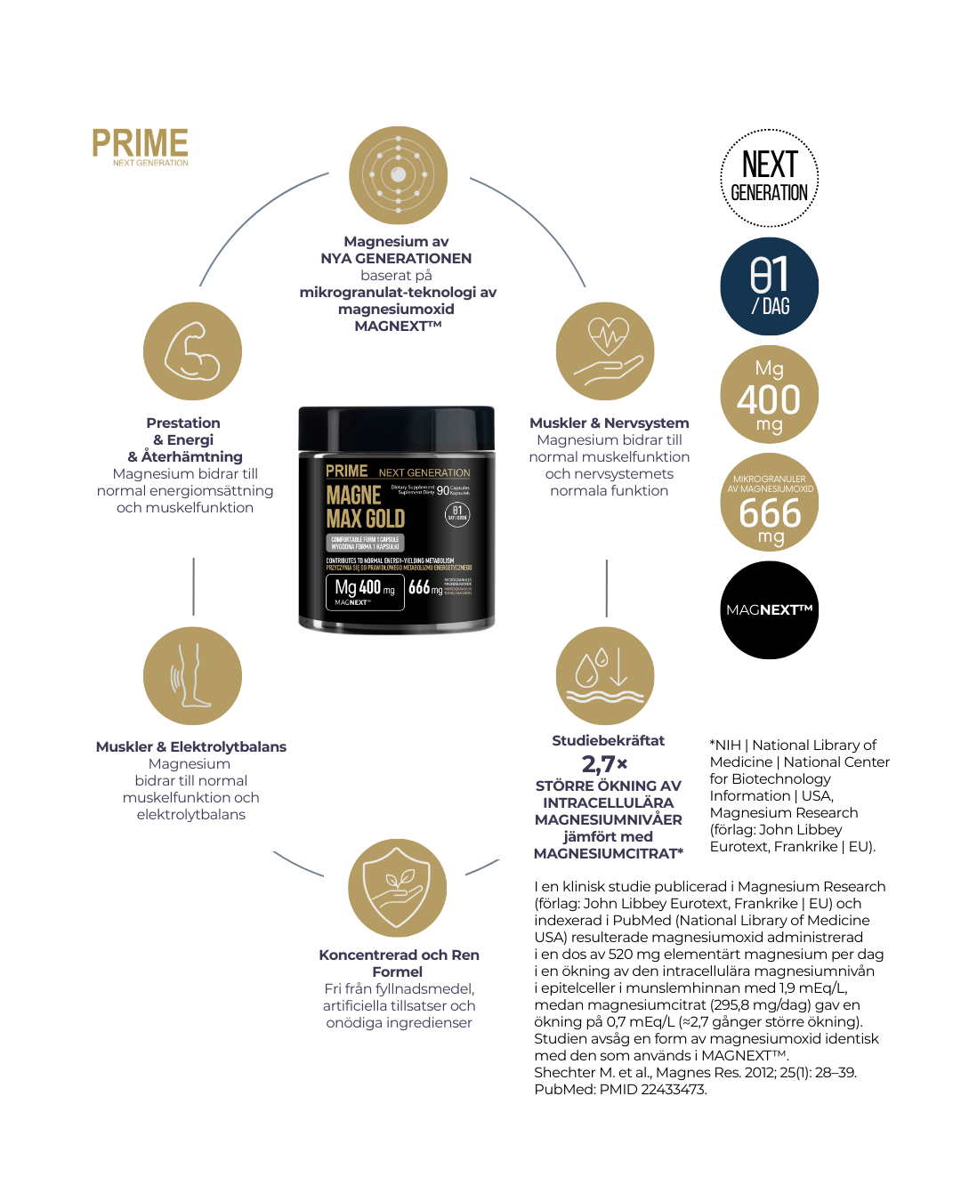 Mikrogranul-teknologin med magnesiumoxid som används i MAGNEXT™ har utvecklats för att stödja en gynnsam upptagningsprofil av magnesium. Studier på en magnesiumoxidform identisk med den som används i produkten har visat en större ökning av intracellulära magnesiumnivåer jämfört med andra magnesiumformer. Hänvisningen till dessa forskningsresultat är enbart informativ och utgör inte ett påstående om medicinska egenskaper.